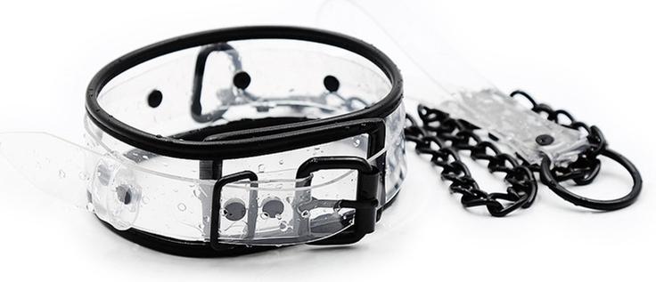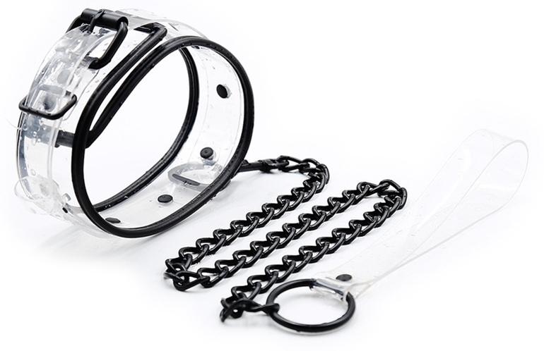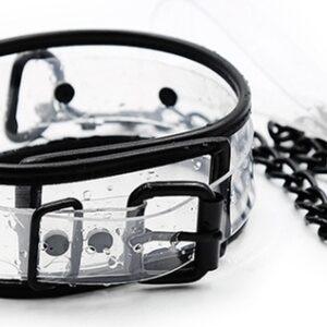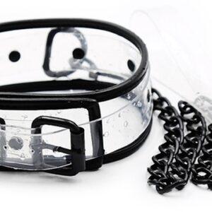 Este collar Aquax Leash es un accesorio extravagante para esos momentos de sumisión.Está compuesto por un color Transparente con bordes y cierres negros. Longitud de 45 cm y fácilmente ajustable para ajustarse al cuello.Ancho de 5,5 cm.Correa metálica de 78 cm. Hecho de plástico