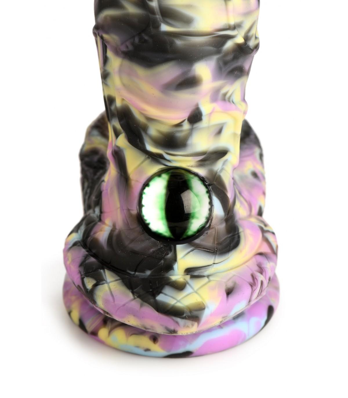 Consolador Fantasy: Este consolador Creature Cocks tiene remolinos de amarillo, rosa y negro que lo camuflan en su tierra natal. La punta puntiaguda y cónica facilita la inserción y el eje texturizado y acanalado lo estimula con cada pasada. ¡Un ojo de gato verde y vidrioso te mira mientras lo montas!