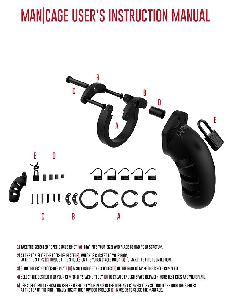 Esta jaula de castidad de la marca ManCage está hecha de silicona. Es suave y permite una mayor comodidad.Mide 11,5 cm de longitud y el diámetro interior es de 3,5 cm.Con 4 anillos de fijación que van de 45 a 60 mm de diámetro.Con candado y cierres de control