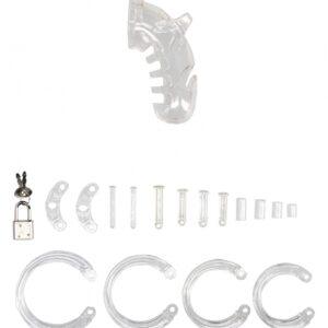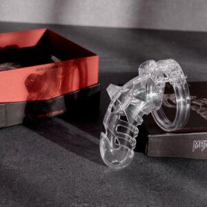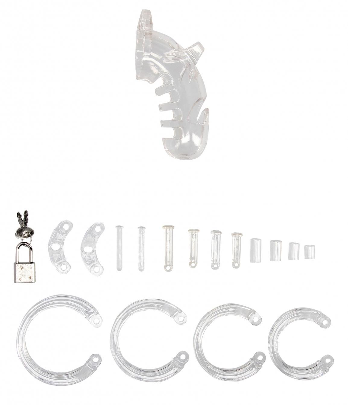 Jaula de castidad con una longitud interior de 11,5 cm y un diámetro interior de 3,5 cm.Forma curva en la parte inferior y gancho en la parte superior.Con anillos de retención de 45, 50, 55 y 60 mm de diámetro.Con candado y precinto.Fabricado en policarbonato