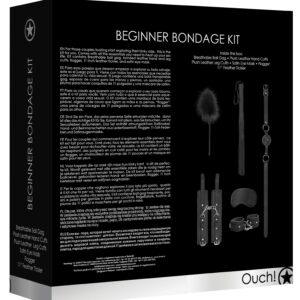 Este kit para principiantes consta de 6 accesorios de bondage: una máscara de rasoEsposas simuladas con piel en el interior (muñecas y tobillos)una mordaza con bola perforadauna imitación de martinetun accesorio para hacer cosquillas
