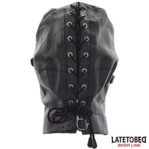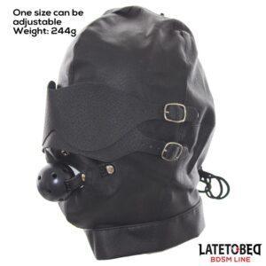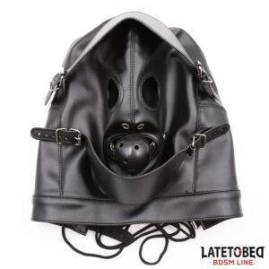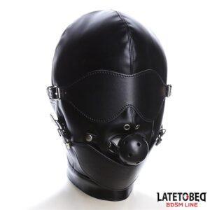 - Con antifaz, una mordaza de bola transpirable y una tapa para la boca