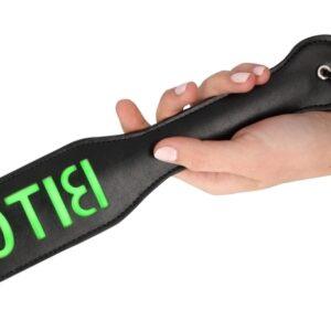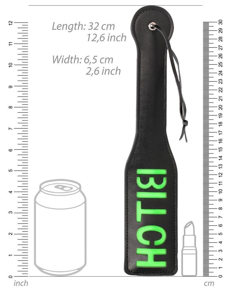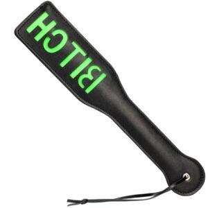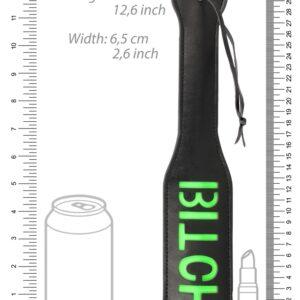 Paleta negra y verde con la palabra «Bitch» en el centro. El color verde es fosforescente.Longitud total 32 cm. Anchura 6,5 cm.En imitación de cuero (poliuretano)