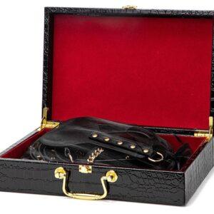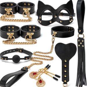 Este set de bondage SM consta de 8 accesorios:una mordaza de bola de siliconauna máscara de cabeza de gatoun mini remoun martinetlas esposas para las muñecaslas esposas para los tobillosPinzas para pezonesEn imitación (poliuretano). Las cadenas están hechas de metal doradoCon caja de almacenamiento